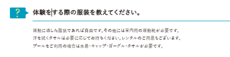 ・動きやすい服装、室内用シューズ、タオル、飲み物、公的身分証明書をご持参ください