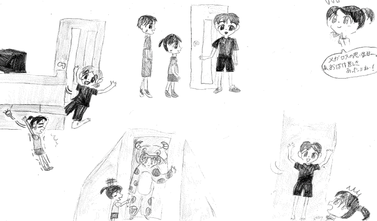 私のメガロスの思い出の中で一番印象に残っているのは「おばけ屋しき」です。メガロスの「おばけ屋しき」では、コーチたちが、桂やかべの後ろから急におどかしてきたことを今でも覚えています。特に印象に残っているのは、四人のコーチです。入口からエレベーターで四階にあがって、いきなり出てくるコーチは、おどろかすのがとてもうまかったです。たけ田コーチがモンスターズインクのサリーの着ぐるみを着ていたのでおもしろかったです。三階のジムの所を通っていたら、いきなりかべの横から、コーチがとび出してきて、追いかけられたのが、とてもこわかったです。階段で二階におりるとヨーヨーすくいや、輪投げをやっていてお祭みたいでした。としコーチがアロハシャツを着てお腹にうきわをつけて盛りあがっていたのが、印象的でした。私は、「おばけ屋しき」でとても大きな楽しい思い出ができました。また、二階のヨーヨーすくいや、輪投げなどのコーチが担当しているお店で、やり方をていねいにするコーチたちは、私に楽しい思い出をつくってくれた大切な人だと思いました。これからも、このメガロスの思い出を大切にしていきたいです。そしてもっと速く泳げるようになって、今度は、私がコーチたちをおどろかしてみたいです。