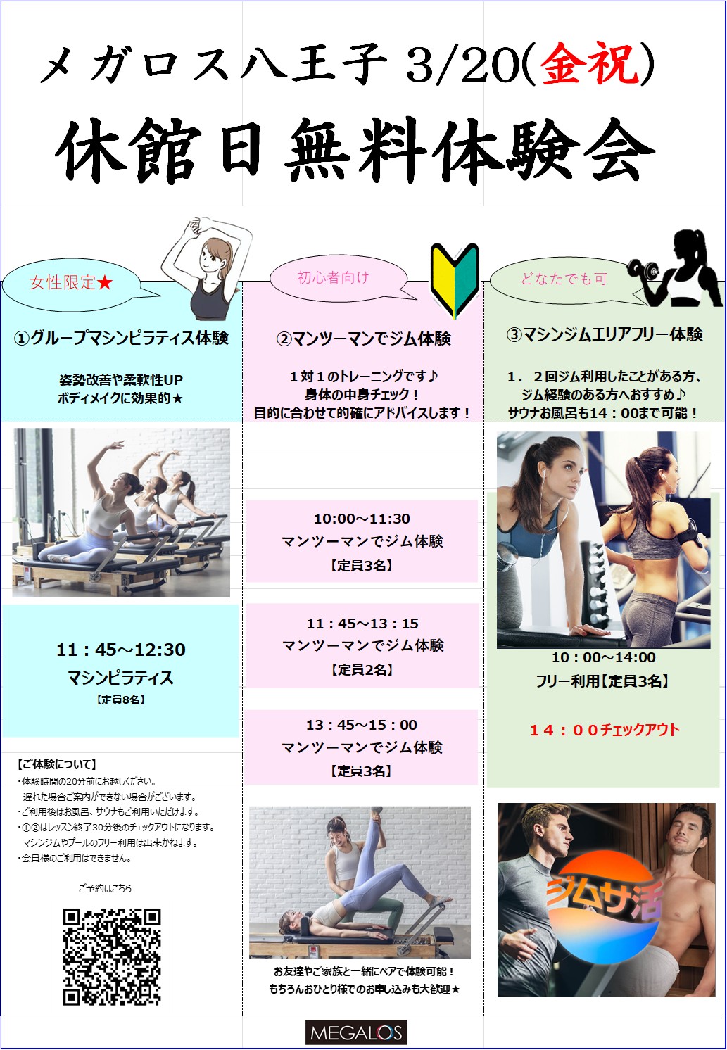 3/20(金祝)休館日グルピラ・パーソナル・ジム利用体験会開催♪