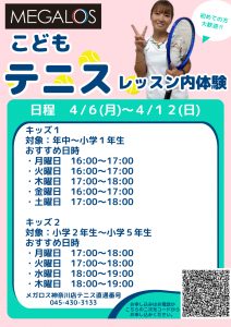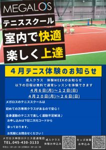 【成人テニス体験】4月成人テニススクール体験情報◆無料体験WEEK 4/6(月)~12(日)◆