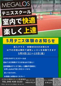 【成人テニス体験】5月成人テニススクール体験情報◆無料体験WEEK 5/9(土)~15(金)◆