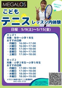 【キッズテニス】5月体験受付中 天候に左右されない室内で、テニスはじめませんか?