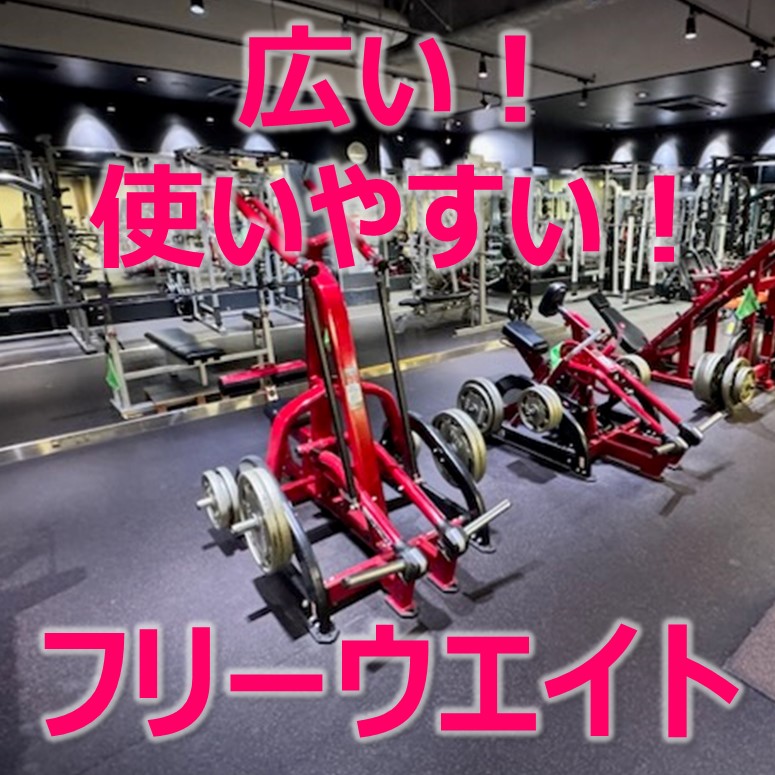 ジムエリアでは開放的な空間、フリーウェイトエリアでは