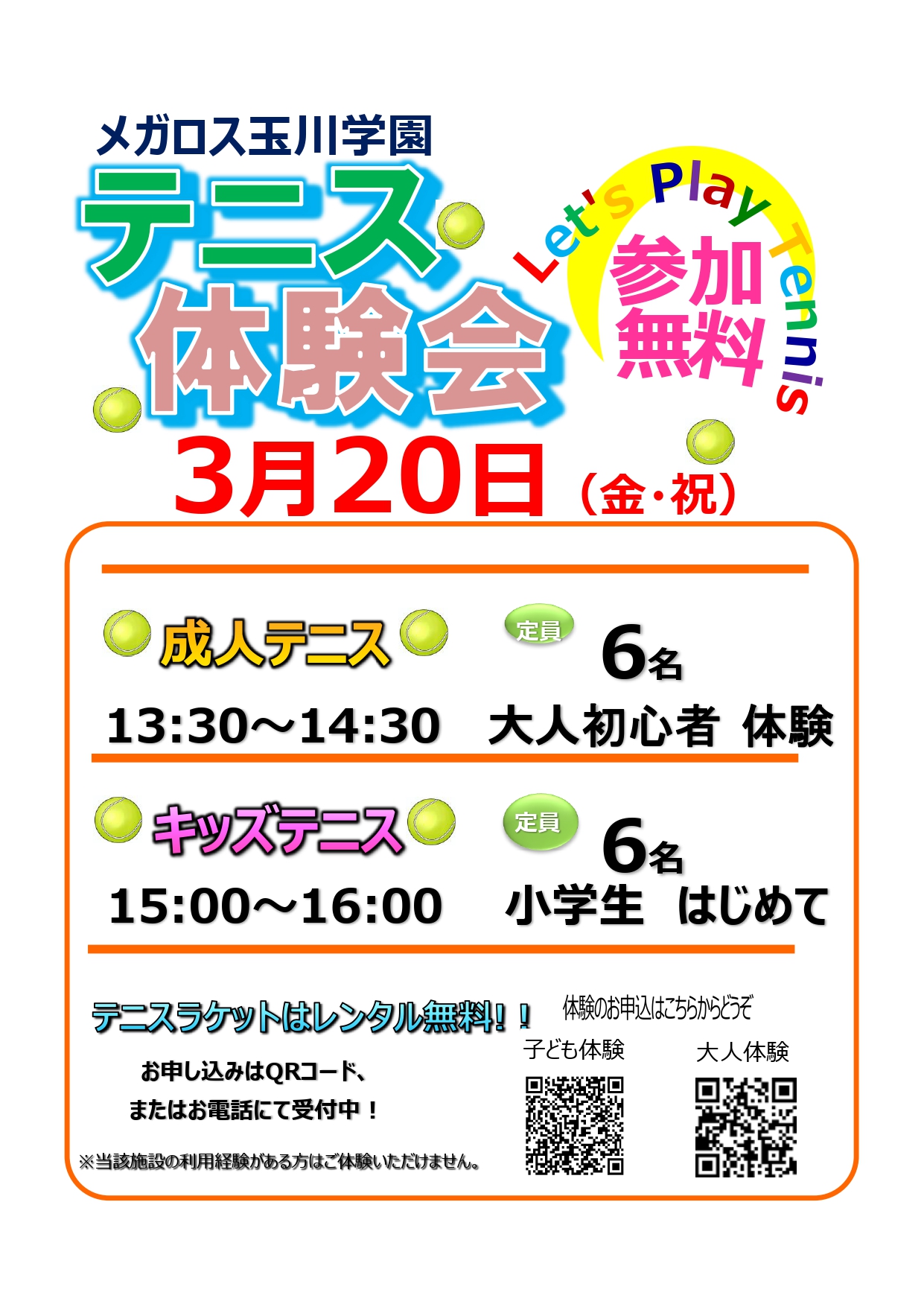 3月20日(金・祝)テニス体験会のお知らせ